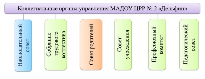 Согласно статье 26 Федерального закона от 29 декабря 2012г. № 273-ФЗ «Об образовании в РФ» и устава МАДОУ ЦРР № 2 «Дельфин» в учреждении созданы и действуют такие органы, как: